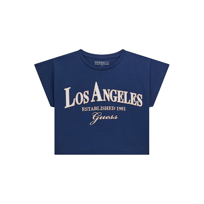 Футболка Guess темно-синего цвета – идеальный выбор для девочек! Изготовлена из 95% хлопка и 5% эластана, она украшена крупным принтом Los Angeles и надписью Established 1981. Футболка с круглым вырезом и короткими рукавами создает комфорт и стиль. На фотографиях видна аккуратная вышивка и мягкая текстура ткани. Качество от бренда из США делает эту футболку отличным выбором для вашего ребенка!