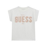 Футболка Guess для девочек – это идеальный выбор для стильных и комфортных образов! Изготовленная из 95% хлопка и 5% эластана, она украшена цветочным принтом и надписью 'Have a Guess Day'. Нежная белая основа с розовыми цветами и золотистой надписью создает легкую и приятную атмосферу. На фотографиях видна аккуратная розовая контрастная окантовка по краю и мягкая текстура ткани. Качество от бренда из США и внимание к деталям делают эту футболку отличным выбором для вашего ребенка!