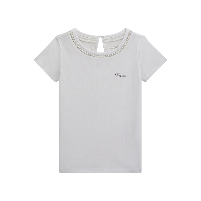 Футболка Guess – это идеальный выбор для девочек от 6 до 12 лет! Изготовлена из 95% хлопка и 5% эластана, она идеально подходит для теплых дней. Белый цвет создает нежный и элегантный образ. Футболка украшена стильным вырезом с бусинами и логотипом Guess на груди. На фотографиях видна аккуратная отделка выреза и мягкая текстура ткани. Качество от бренда из США делает эту футболку отличным выбором для вашего ребенка!