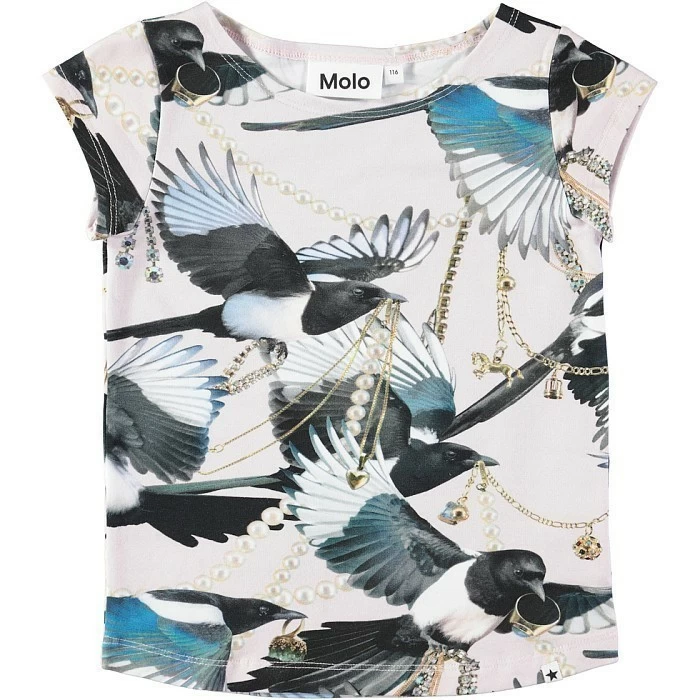 Футболка Molo – это идеальный выбор для девочек! Изготовленная из 95% хлопка и 5% эластана, она украшена очаровательным принтом птиц и бусин. Изящные перья, золотые цепочки и бусины создают нежный и стильный образ. На фотографии видны аккуратные детали, такие как золотые кольца и бусины, а также мягкая текстура ткани. Качество от бренда из Украины делает эту футболку отличным выбором для вашего ребенка!