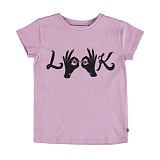 Футболка для девочек Molo – это стильный и комфортный выбор для вашего ребенка! Изготовлена из 100% хлопка, она украшена оригинальным принтом рук, делающими буквы "L", "O", "O", "K". Нежная розовая основа с черными элементами создает модный и современный образ. На фотографии видна аккуратная черная контрастная окантовка по краю и мягкая текстура ткани. Качество от бренда из Индии и внимание к деталям делают эту футболку отличным выбором для вашего девочки!