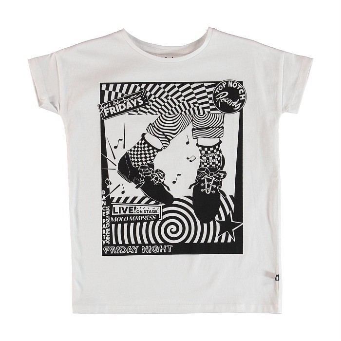 Футболка Molo – это идеальный выбор для девочек! Изготовленная из 100% хлопка, она украшена оригинальным принтом с изображением ног в клетчатых носках и кроссовках, а также надписями "Friday Night" и "Top Notch Records". Футболка идеально подходит для активного отдыха и игр. На фотографиях видна аккуратная вышивка и мягкая текстура ткани. Качество от бренда из Индии и внимание к деталям делают эту футболку отличным выбором для вашего ребенка!