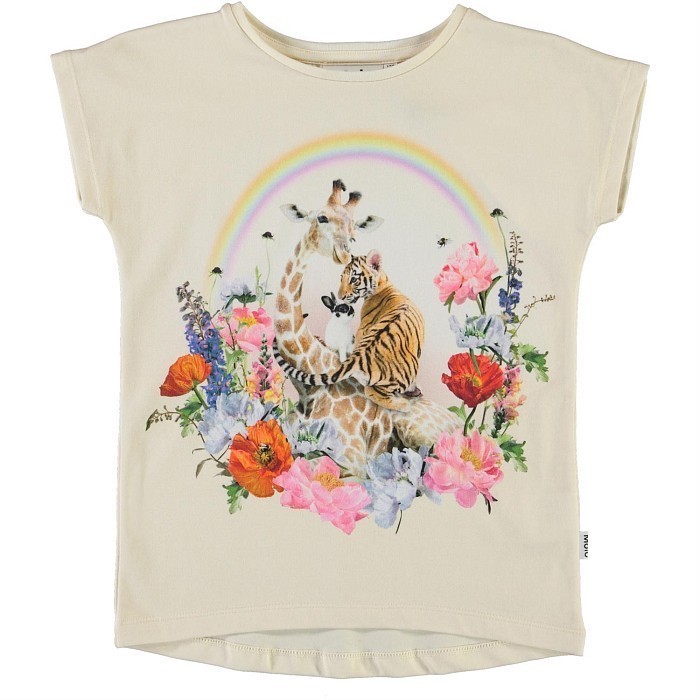 Футболка Molo – это идеальный выбор для девочек! Изготовленная из 95% органического хлопка и 5% эластана, она украшена очаровательным принтом с животными и цветами. На футболке изображены милые животные, окруженные яркими цветами и радужным фоном. Нежная текстура ткани и удобная посадка делают эту футболку отличным выбором для вашего ребенка!