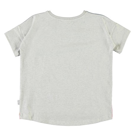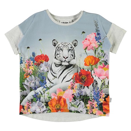 Футболка Molo – это идеальный выбор для маленькой модницы! Изготовленная из 95% органического хлопка и 5% эластана, она украшена очаровательным принтом белого тигра, сидящего среди разноцветных цветов. Нежная белая основа с яркими цветами и белым тигром создает игривое и в то же время уютное настроение. На фотографии видна аккуратная белая окантовка по краю и мягкая текстура ткани. Качество от бренда из Дании и внимание к деталям делают эту футболку отличным выбором для вашего ребенка!
