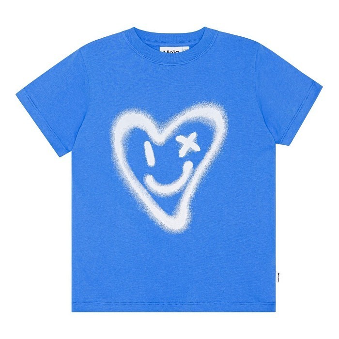 Футболка Molo – это идеальный выбор для девочек! Изготовленная из 100% натурального хлопка, она украшена очаровательным принтом сердца с улыбкой. Нежная голубая основа с белым принтом создает легкое и в то же время уютное настроение. На фотографиях видна аккуратная белая контрастная окантовка по краю и мягкая текстура ткани. Качество от бренда из Дании и внимание к деталям делают эту футболку отличным выбором для вашего ребенка!