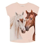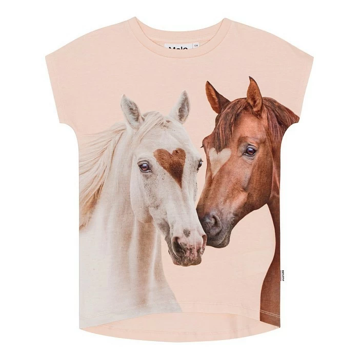 Футболка для девочек Molo – это идеальный выбор для маленьких лошадиных фанатов! Изготовленная из 95% натурального хлопка и 5% эластана, она украшена очаровательными изображениями двух лошадей, одна белая, другая рыжая, обе с сердечками на мордочках. Нежная розовая основа с яркими контрастными элементами создает игривое и в то же время уютное настроение. На фотографиях видна аккуратная белая контрастная окантовка по краю и мягкая текстура ткани. Качество от бренда из Дании и внимание к деталям делают эту футболку отличным выбором для вашего ребенка!