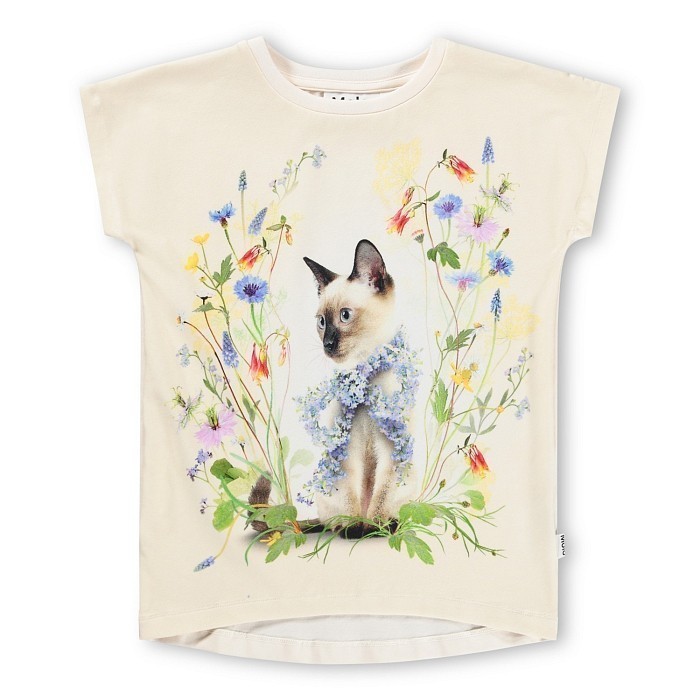 Футболка для девочек Molo молочного цвета с принтом кошки и цветов