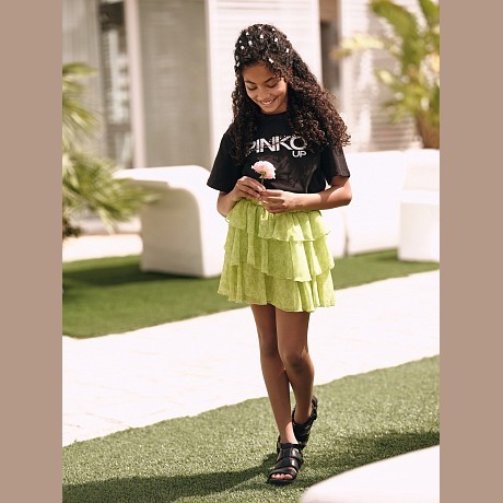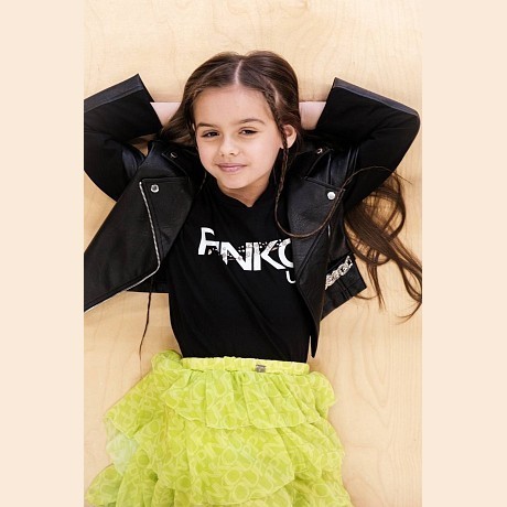 Футболка для девочки Pinko Up – это идеальный выбор для стильных и активных девочек! Изготовленная из 96% хлопка и 4% эластана, она обеспечивает комфорт и свободу движений. На черном фоне футболка украшена крупным белым принтом Pinko Up, который добавляет модели уникальности и стиля. На фотографиях видна аккуратная вышивка по краю и мягкая текстура ткани. Качество от итальянского бренда и внимание к деталям делают эту футболку отличным выбором для вашего ребенка!