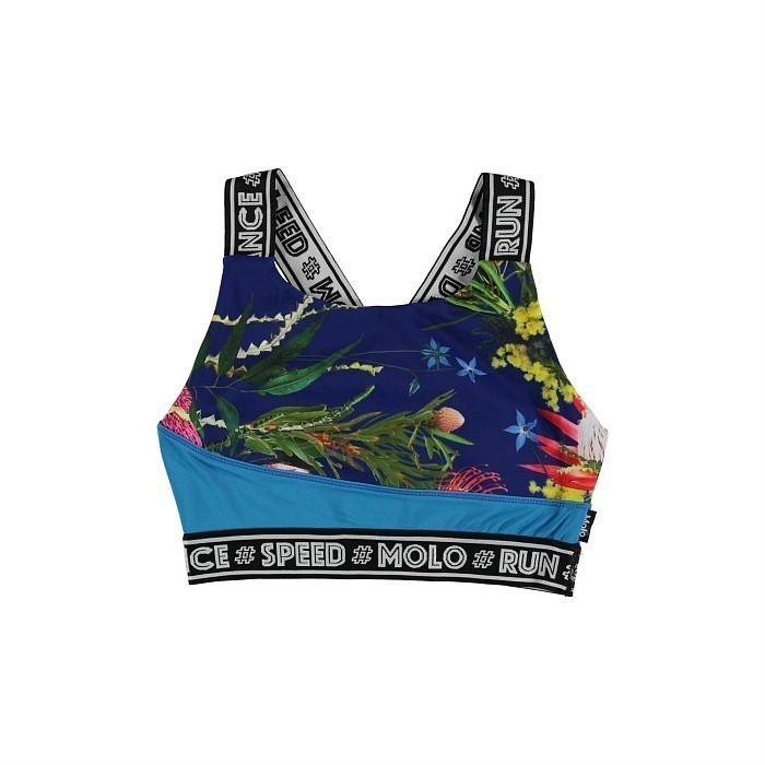Топ для девочки Molo с изысканным цветочным принтом на синем фоне. Модель выполнена из комбинации 79% полиэстера и 21% эластана, что обеспечивает комфорт и эластичность. Топ украшен яркими цветами и зелеными листьями, создавая нежный и веселый образ. На фото видна аккуратная голубая окантовка по краю и мягкая текстура ткани. Качество от бренда из Китая и внимание к деталям делают этот топ отличным выбором для вашего ребенка!