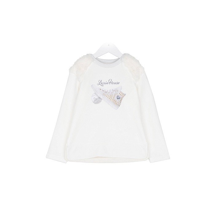 Белая блуза для девочек с меховыми вставками и принтом кроссовок