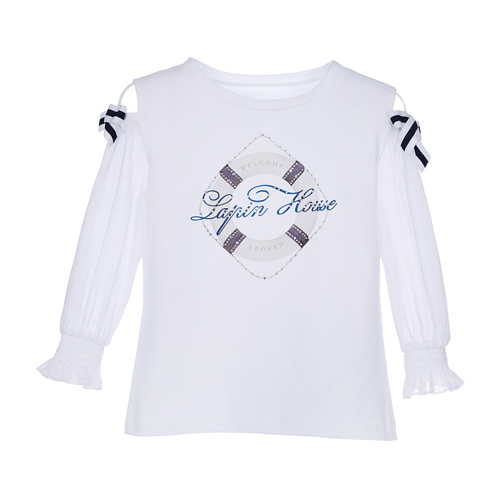 Блуза тр. для девочек Lapin House – это идеальный выбор для стильных и комфортных образов! Изготовленная из 96% хлопка и 4% эластана, она украшена очаровательным принтом и бантиками на плечах. Блуза трендовая, с элегантным круговым принтом и надписью "Lapin House" в центре. Нежная белая основа с аккуратными бантиками создает неповторимый стиль и комфорт. На фотографии видны аккуратные бантики на плечах и мягкая текстура ткани. Качество от бренда из Греции и внимание к деталям делают эту блузу отличным выбором для вашего ребенка!