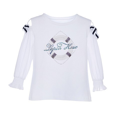 Блуза тр. для девочек Lapin House – это идеальный выбор для стильных и комфортных образов! Изготовленная из 96% хлопка и 4% эластана, она украшена очаровательным принтом и бантиками на плечах. Блуза трендовая, с элегантным круговым принтом и надписью "Lapin House" в центре. Нежная белая основа с аккуратными бантиками создает неповторимый стиль и комфорт. На фотографии видны аккуратные бантики на плечах и мягкая текстура ткани. Качество от бренда из Греции и внимание к деталям делают эту блузу отличным выбором для вашего ребенка!