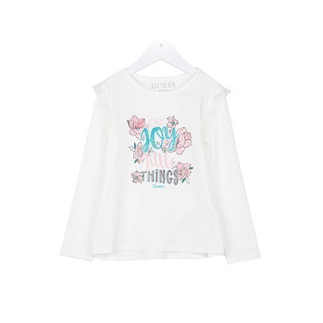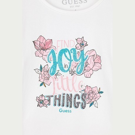 Блузка Guess для девочек – это идеальный выбор для стильных и комфортных образов! Изготовлена из 95% хлопка и 5% эластана, дополнена 100% полиэстером. Цветочный принт с надписью "Find Joy in the Little Things" придает блузке нежность и легкость. Нежные розовые цветы и зеленые листья создают яркий и приятный образ. На фото видна мягкая текстура ткани, аккуратная отделка краев и удобная посадка. Качество от бренда из Китая и внимание к деталям делают эту блузку отличным выбором для вашего ребенка!