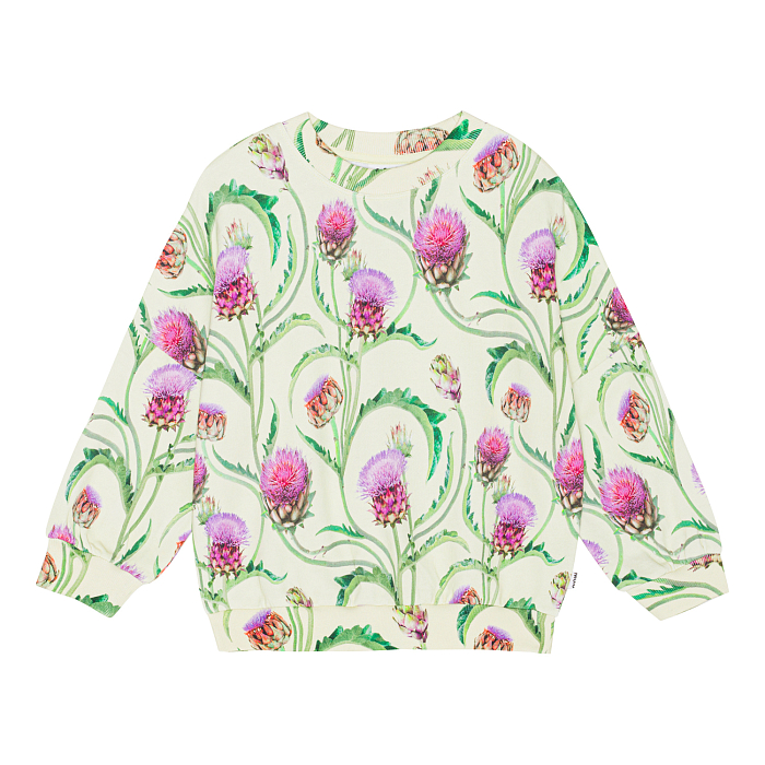 Джемпер Molo – это идеальный выбор для маленьких модниц! Изготовленный из 100% натурального хлопка, он украшен очаровательным цветочным принтом с розовыми и фиолетовыми цветами на зеленых листьях. Нежная текстура ткани и удобная посадка делают этот джемпер комфортным и стильным для вашего ребенка. На фотографиях видна аккуратная окантовка по краю и мягкая текстура ткани. Качество от бренда из Дании и внимание к деталям делают эту одежду отличным выбором для вашего малыша!