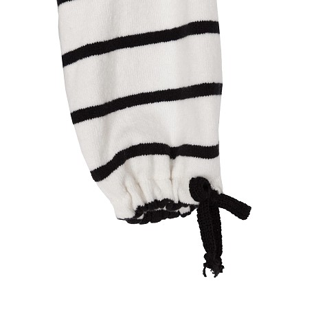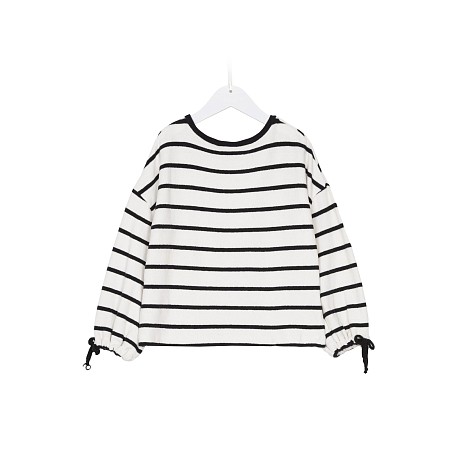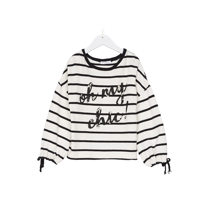 Джемпер Elsy – это идеальный выбор для маленьких модниц! Изготовленный из комбинации 48% хлопка, 48% акрила и 4% эластана, он украшен очаровательным принтом "Oh my chic" и черными полосами. Нежная белая основа с черными полосами и яркими бусинами создает игривое и в то же время элегантное настроение. На фотографии видна аккуратная черная контрастная окантовка по краю и мягкая текстура ткани. Качество от бренда из Албании и внимание к деталям делают этот джемпер отличным выбором для вашего ребенка!