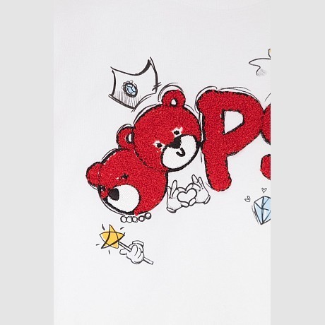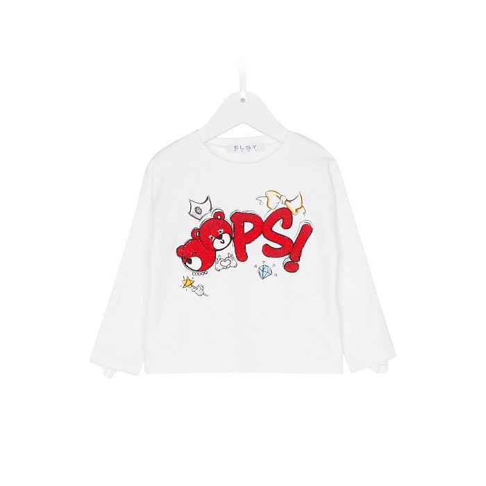 Джемпер Elsy – это идеальный выбор для девочек! Изготовленный из 95% хлопка и 5% эластана, он украшен очаровательным принтом медведя с надписью OPS! на белом фоне. Мягкая ткань обеспечивает комфортную посадку, а принт придает модели нежный и забавный вид. На фотографиях видны детали: милые медведи, надпись OPS! в стиле каллиграфии, бант и бриллиант, а также эластичная резинка на горловине. Качество от итальянского бренда Elsy и внимание к деталям делают этот джемпер отличным выбором для вашего ребенка!