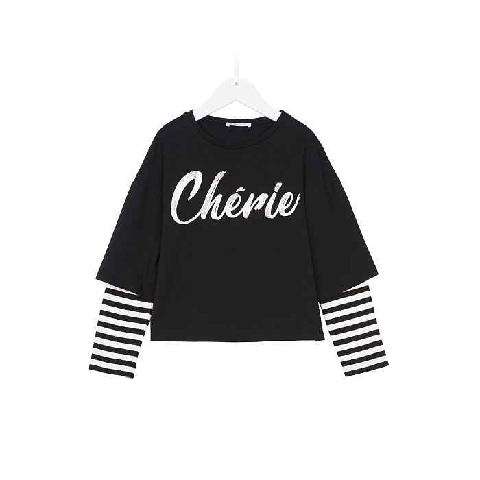 Джемпер Elsy – это идеальный выбор для стильных девочек! Изготовлен из 95% хлопка и 5% эластана, а также дополнен контрастными рукавами в черно-белую полоску. Принт Chérie в стиле каллиграфии придает модели особую элегантность и шарм. Качество от итальянского бренда Elsy обеспечивает мягкость и комфорт для нежной кожи. На фотографии видна аккуратная полоска по краю рукавов и мягкая текстура ткани. Джемпер идеально подходит для девочек в возрасте от 18 до 2 лет.