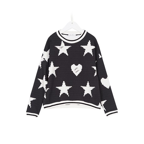 Джемпер Elsy – это идеальный выбор для девочек! Изготовленный из 93% хлопка и 7% эластана, он украшен очаровательными белыми звездами и сердечками на черном фоне. Нежная фактура ткани и аккуратная белая окантовка по краю создают стильный и комфортный образ. На фотографиях видны аккуратные белые звезды и сердечки, а также мягкая текстура ткани. Качество от итальянского бренда и внимание к деталям делают этот джемпер отличным выбором для вашего ребенка!