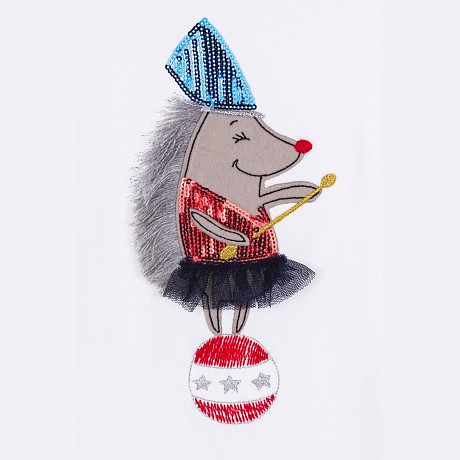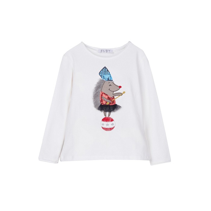Джемпер Elsy – это идеальный выбор для девочек! Изготовленный из 95% хлопка и 5% эластана, он украшен очаровательным принтом мыши на шаре. Мягкая белая основа с яркими деталями создает игривое и в то же время уютное настроение. На фотографии видна аккуратная голубая контрастная окантовка по краю и мягкая текстура ткани. Качество от бренда из Италии и внимание к деталям делают эту одежду отличным выбором для вашего ребенка!