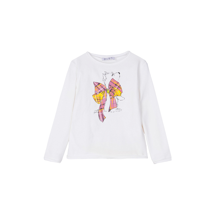 Джемпер Elsy – это идеальный выбор для девочек! Изготовленный из комбинации 95% хлопка и 5% эластана, он обеспечивает комфорт и мягкость для нежной кожи. Джемпер украшен очаровательным принтом с милой лисой и ярким бантом. Нежная белая основа с красочными деталями создает уютное и в то же время стильное настроение. На фотографии видна аккуратная контрастная окантовка по краю и мягкая текстура ткани. Качество от итальянского бренда и внимание к деталям делают этот джемпер отличным выбором для вашего ребенка!