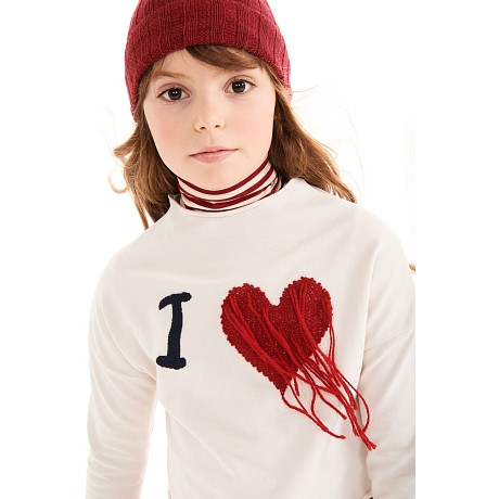 Джемпер Elsy – это идеальный выбор для девочек! Изготовленный из 95% хлопка и 5% эластана, он украшен принтом I ❤️ в виде сердца. Нежная белая основа с красным сердцем и черными буквами создает стильный и уютный образ. На фотографиях видна аккуратная вышивка и мягкая текстура ткани. Качество от бренда из Китая и внимание к деталям делают этот джемпер отличным выбором для вашего ребенка!