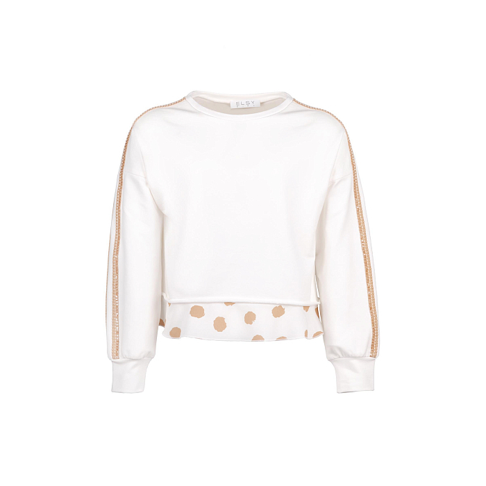 Джемпер Elsy – это идеальный вариант для стильных девочек! Изготовлен из 95% хлопка и 5% эластана, он украшен элегантным принтом бежевых точек и отделкой из 100% полиэстера. Нежная текстура ткани и мягкая отделка делают этот джемпер идеальным для повседневной носки. На фотографиях видны аккуратные бежевые точки и эластичные вставки по краям рукавов и низу изделия. Качество и стиль от итальянского бренда Elsy делают этот джемпер отличным выбором для вашего ребенка!