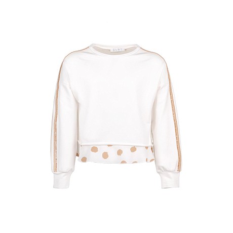 Джемпер Elsy – это идеальный вариант для стильных девочек! Изготовлен из 95% хлопка и 5% эластана, он украшен элегантным принтом бежевых точек и отделкой из 100% полиэстера. Нежная текстура ткани и мягкая отделка делают этот джемпер идеальным для повседневной носки. На фотографиях видны аккуратные бежевые точки и эластичные вставки по краям рукавов и низу изделия. Качество и стиль от итальянского бренда Elsy делают этот джемпер отличным выбором для вашего ребенка!