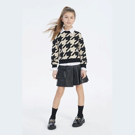 Джемпер Elsy – это идеальный выбор для стильных девочек! Изготовленный из комбинации хлопка и акрила, он украшен элегантным геометрическим принтом в черно-белых тонах. Нежная фактура ткани и аккуратная отделка делают эту вещь не только стильной, но и комфортной. На фотографиях видна аккуратная черная окантовка по краю и мягкая текстура ткани. Качество от итальянского бренда и внимание к деталям делают этот джемпер отличным выбором для вашего ребенка!