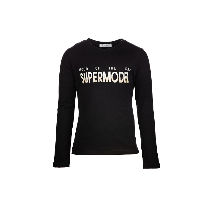 Джемпер Elsy – это идеальный выбор для девочек! Изготовленный из 95% хлопка и 5% эластана, он украшен стильным принтом Supermodel и надписью Mood of the Day. Нежная черная основа с белыми и золотистыми буквами создает модный и в то же время уютный образ. На фотографиях видна аккуратная вышивка по краю и мягкая текстура ткани. Качество от итальянского бренда и внимание к деталям делают этот джемпер отличным выбором для вашего ребенка!