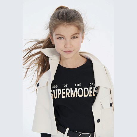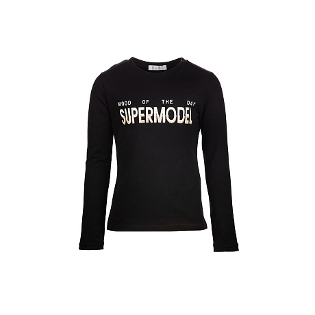 Джемпер Elsy – это идеальный выбор для девочек! Изготовленный из 95% хлопка и 5% эластана, он украшен стильным принтом Supermodel и надписью Mood of the Day. Нежная черная основа с белыми и золотистыми буквами создает модный и в то же время уютный образ. На фотографиях видна аккуратная вышивка по краю и мягкая текстура ткани. Качество от итальянского бренда и внимание к деталям делают этот джемпер отличным выбором для вашего ребенка!