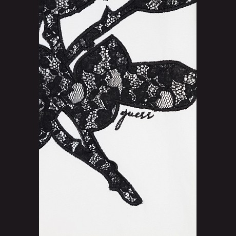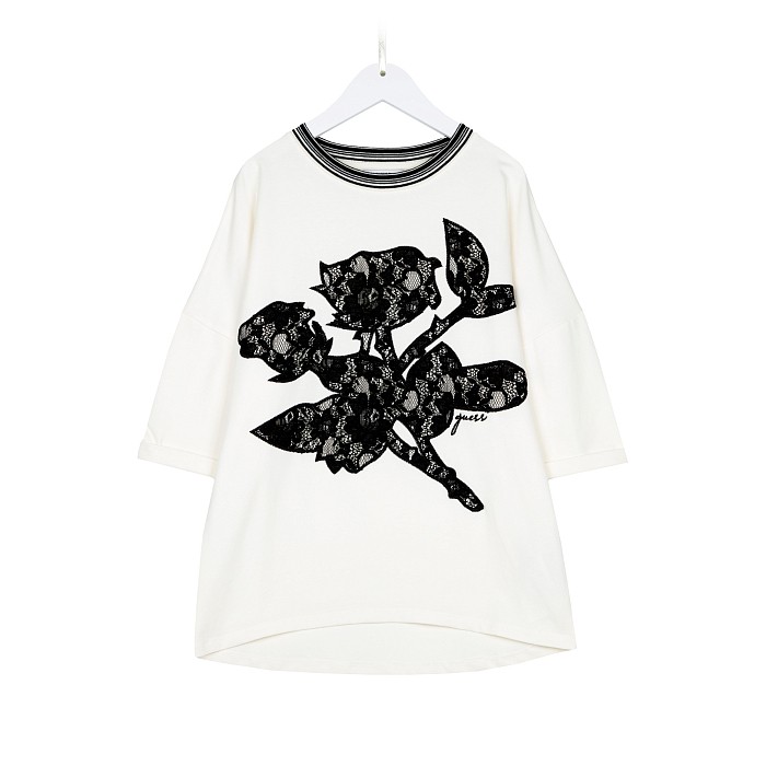 Джемпер Guess – это идеальный выбор для стильных девочек! Изготовленный из 95% хлопка и 5% эластана, он украшен изысканным кружевным принтом роз и листьев. Нежная белая основа с черными кружевными элементами создает элегантное и в то же время комфортное настроение. На фотографии видна аккуратная черная контрастная окантовка по краю и мягкая текстура ткани. Качество от бренда из Китая и внимание к деталям делают этот джемпер отличным выбором для вашего ребенка!