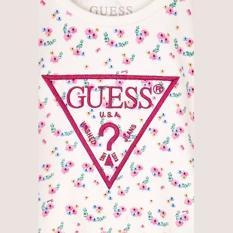 - 🎨 Дизайн: цветочный принт, логотип Guess, круглый вырез, длинные рукава