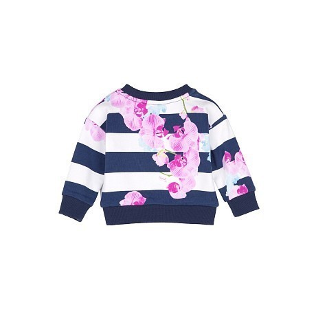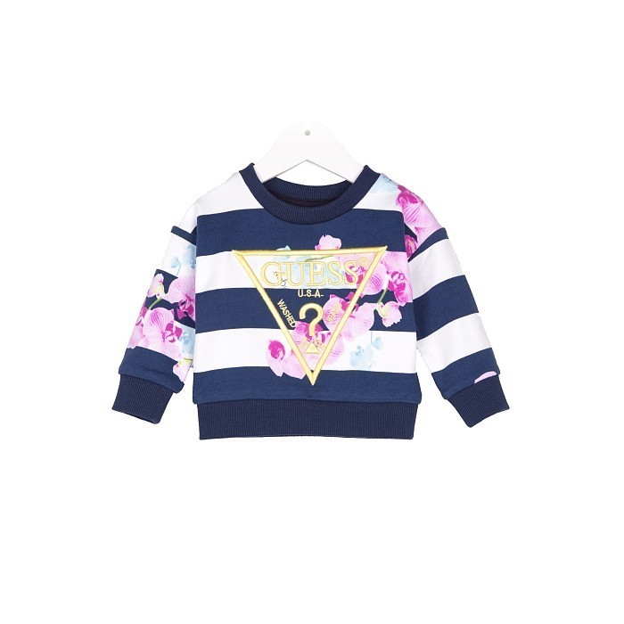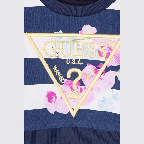 Джемпер Guess – это идеальный выбор для вашего маленькой модницы! Изготовленный из 100% хлопка, он украшен очаровательным цветочным принтом и логотипом Guess. Джемпер с белыми и синими полосами, украшенными цветочками, создает стильный и уютный образ. На фотографии видна аккуратная вышивка логотипа Guess и цветочные мотивы. Качество от бренда из США и внимание к деталям делают этот джемпер отличным выбором для вашего ребенка!