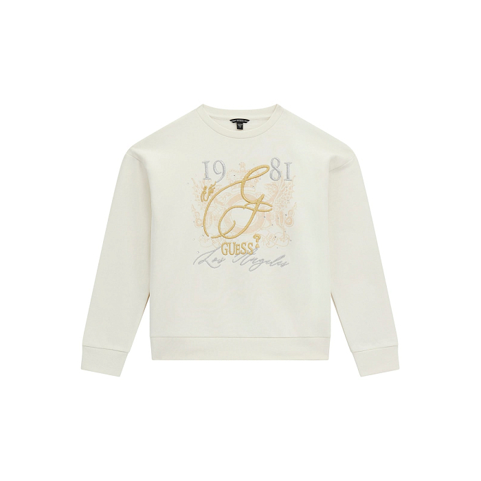 Джемпер Guess – это идеальный выбор для стильных девочек! Изготовлен из 100% хлопка, он украшен элегантным принтом с надписью 1981 и логотипом Guess. Нежная белая основа с золотистым принтом создает стильный и современный образ. На фотографиях видна аккуратная вышивка и мягкая текстура ткани. Качество от бренда из США и внимание к деталям делают этот джемпер отличным выбором для вашего ребенка!