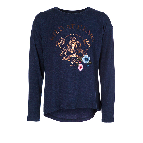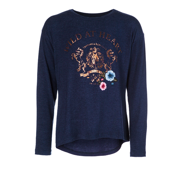 Джемпер для девочек Lapin House – это идеальный выбор для стильных и комфортных выходов! Изготовленный из вискозы, полиэстера и эластана, он украшен очаровательным принтом Wild at Heart, который включает в себя изображение льва, цветы и надпись Wild at Heart. Джемпер с круглым вырезом горловины и длинными рукавами идеально подойдет для девочек любого возраста. На фотографии видна аккуратная текстура ткани и мягкая окантовка по краю. Качество от бренда из Греции и внимание к деталям делают этот джемпер отличным выбором для вашего ребенка!