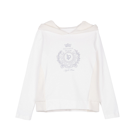 Джемпер для девочек Lapin House – это идеальный выбор для стильных и комфортных образов! Белый цвет, 58% хлопка, 19% вискоза, 9% полиэстер, 9% полиамид и 5% эластан обеспечивают мягкость и уют. Элегантный принт логотипа на груди делает эту вещь еще более привлекательной. На фотографии видна аккуратная вышивка логотипа с лавровыми венками и надписью "Exclusive Team". Джемпер с капюшоном и эластичными манжетами идеально подойдет для девочек любого возраста!