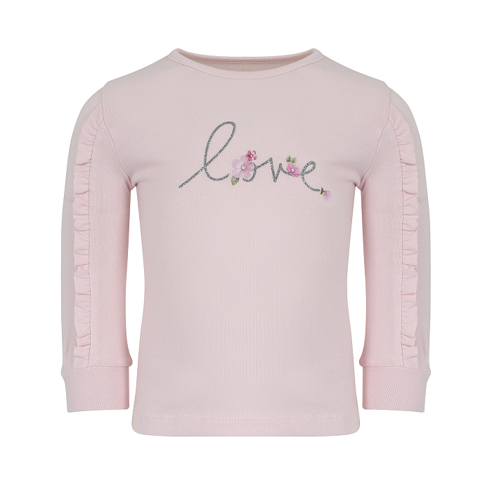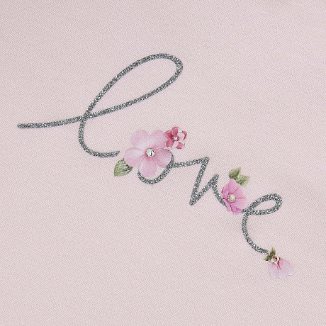 - 🎨 Дизайн: принт love с цветочками и блестками, аккуратная отделка на рукавах