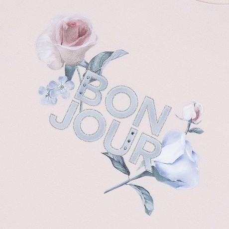 - 🎨 Дизайн: бледно-розовый, принт Bonjour, цветы, эластичные манжеты