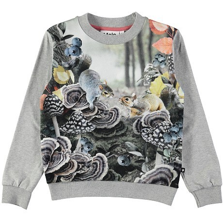 Джемпер для девочек Molo – это идеальный выбор для вашего маленькой модницы! Изготовленный из 95% хлопка и 5% эластана, он украшен очаровательным принтом с изображением грибов и белок на фоне леса. Нежная серая основа с яркими деталями создает игривое и в то же время уютное настроение. На фотографии видны аккуратные белые и серые грибы, а также милые белки, которые создают волшебную атмосферу. Качество от бренда из Украины и внимание к деталям делают этот джемпер отличным выбором для вашего ребенка!