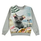 Джемпер для девочек Molo – это идеальный выбор для стильных и комфортных выходов! Изготовленный из 95% хлопка и 5% эластана, он украшен очаровательным принтом кошки на пляже. На передней части видна кошка в солнцезащитных очках, украшенная цветами, сидящая на пляже с пляжным полотенцем и собакой. Нежная ткань и удобная посадка делают этот джемпер отличным выбором для вашего ребенка!