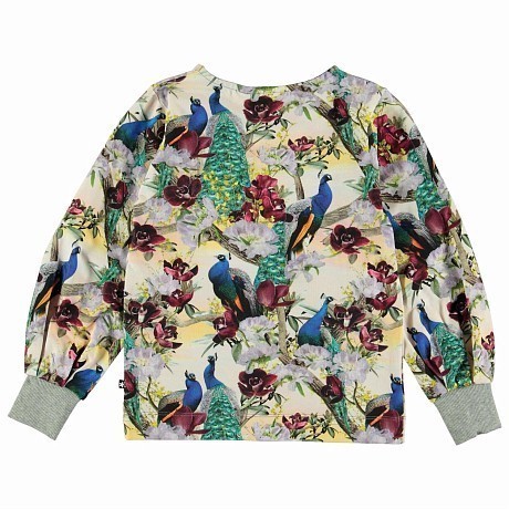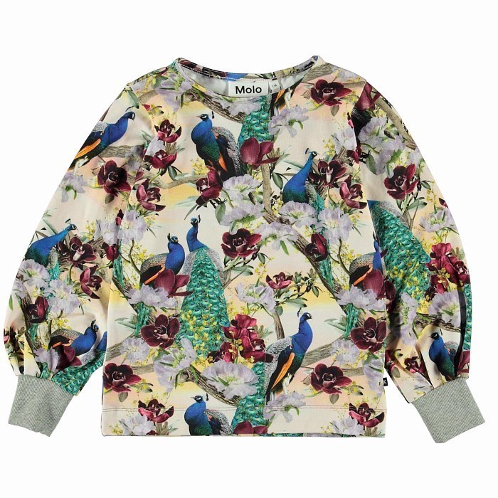 Джемпер Molo – это идеальный выбор для стильных девочек! Изготовлен из 95% хлопка и 5% эластана, он украшен очаровательным принтом с яркими павлинами и цветами. Великолепный дизайн с яркими павлинами и цветами создает неповторимое настроение. На фотографии видна аккуратная серая окантовка по краю рукавов и мягкость ткани. Качество от бренда из Индии и внимание к деталям делают этот джемпер отличным выбором для вашего ребенка!
