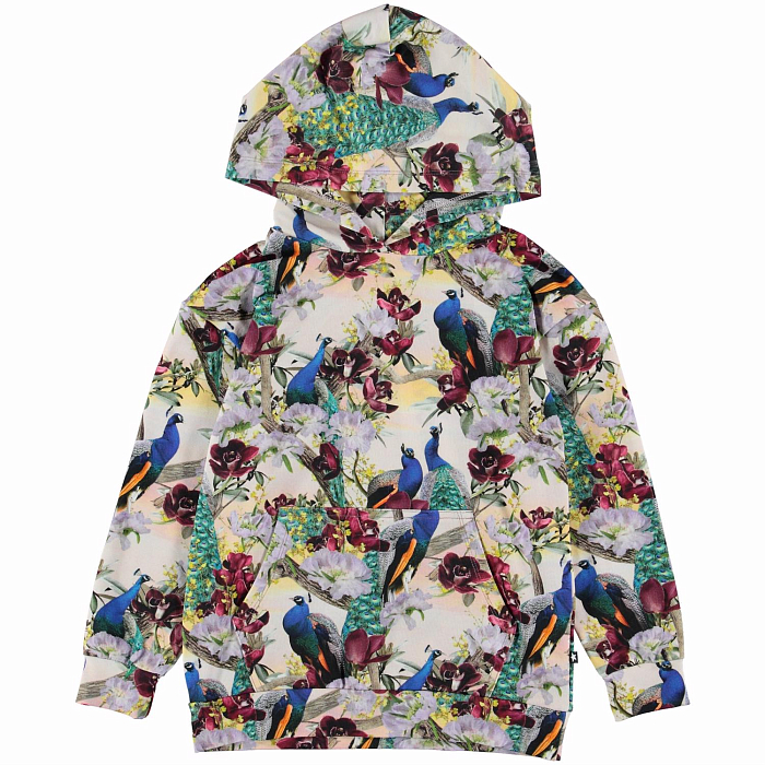 Джемпер для девочек Molo – это идеальный выбор для стильных и комфортных образов! Изготовлен из 95% хлопка и 5% эластана, он украшен изысканным принтом с изображением павлинов и цветов. Элегантный дизайн с яркими павлинами и нежными цветами создает неповторимую атмосферу. На фотографии видна аккуратная контрастная окантовка по краю и мягкая текстура ткани. Качество от бренда из Индии и внимание к деталям делают этот джемпер отличным выбором для вашего ребенка!