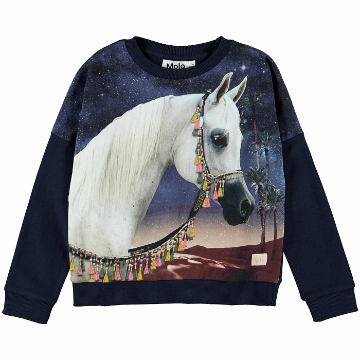 Джемпер для девочек Molo – это идеальный выбор для стильных и комфортных образов! Изготовленный из 100% хлопка, он украшен очаровательным принтом лошади с бахромой и пальмами на фоне ночного неба. Нежная ткань и яркий принт создают неповторимую атмосферу. На фотографии видна аккуратная бахрома по краю и мягкое воротничное кольцо. Качество от бренда из Индии и внимание к деталям делают этот джемпер отличным выбором для вашего ребенка!