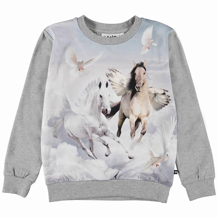 Джемпер Molo – это идеальный выбор для девочек! Изготовленный из 95% хлопка и 5% эластана, он украшен очаровательным принтом летающих лошадей и голубей. На фоне нежно-голубого неба и белых облаков изображены две лошади с крыльями и несколько белых голубей, летящих рядом. Нежная ткань и удобная посадка делают этот джемпер комфортным и стильным выбором для вашего ребенка!