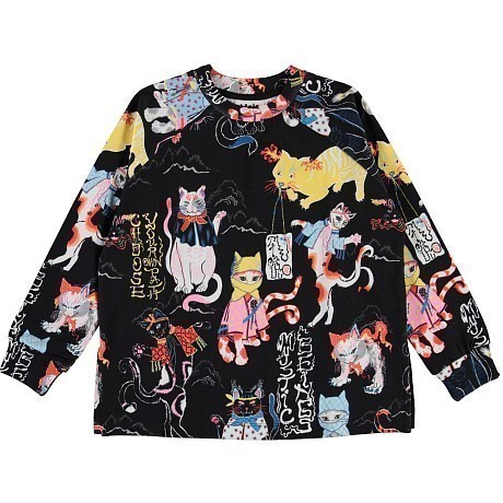 Джемпер Molo – это идеальный выбор для девочек! Изготовленный из 100% хлопка, он украшен очаровательными кошками в ярких нарядах и японских костюмах. Нежная черная основа с яркими кошками и японскими элементами создает игривое и в то же время уютное настроение. На фотографиях видны аккуратные детали, такие как вышивка и яркие акценты на кошках. Качество от бренда из Дании и внимание к деталям делают этот джемпер отличным выбором для вашего ребенка!