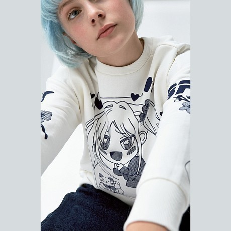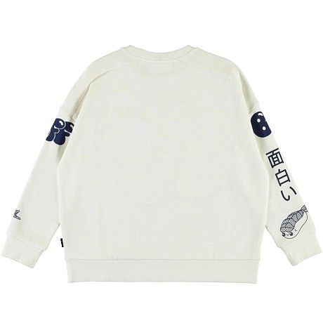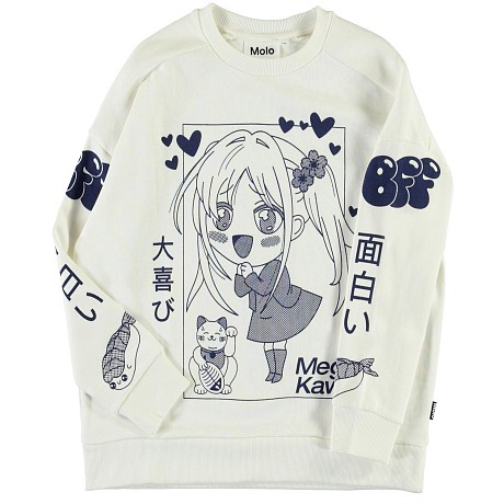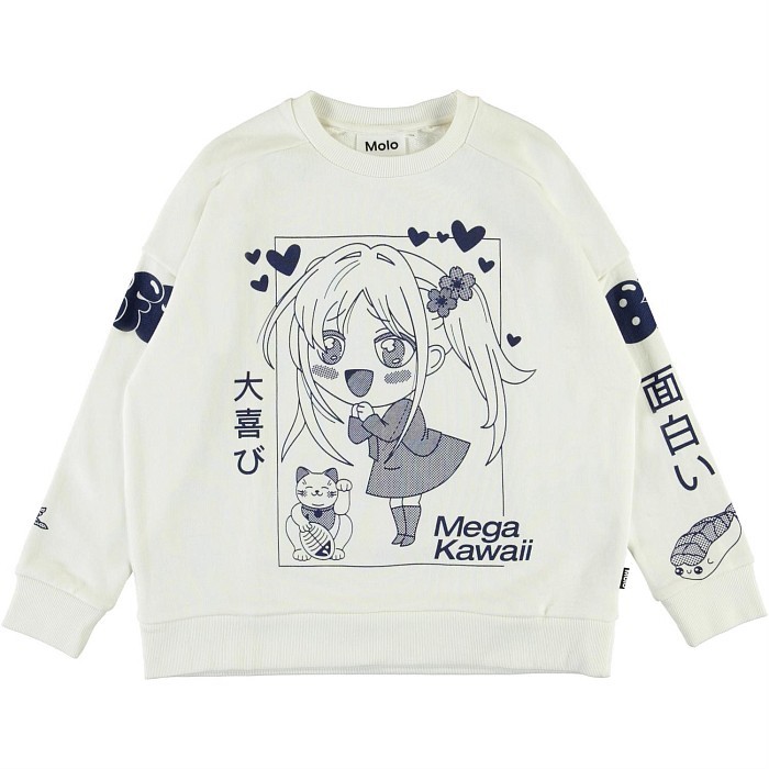 Джемпер Molo – это идеальный выбор для маленьких модниц! Изготовленный из 70% хлопка и 30% вискозы, он украшен очаровательным принтом Мега Каваи с японскими символами. Мягкая белая основа с синими акцентами создает нежное и в то же время яркое настроение. На фотографии видна аккуратная синяя контрастная окантовка по краю и мягкая текстура ткани. Качество от бренда из Дании и внимание к деталям делают этот джемпер отличным выбором для вашего ребенка!