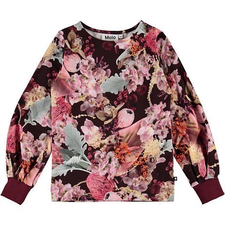 Джемпер для девочек Molo – это идеальный выбор для вашего маленькой модницы! Изготовленный из 95% хлопка и 5% эластана, он украшен изысканным цветочным принтом с розовыми и бордовыми цветами на темном фоне. Нежная ткань и эластичные манжеты делают этот джемпер удобным и комфортным для ношения. На фотографии видны яркие цветы и листья, а также эластичные манжеты на рукавах. Качество от бренда из Дании и внимание к деталям делают этот джемпер отличным выбором для вашего ребенка!