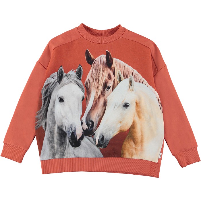Джемпер Molo – это идеальный выбор для девочек! Изготовлен из 100% органического хлопка, он украшен трёхцветным принтом с изображением лошадей. Красивый джемпер с мягкими рукавами и эластичной резинкой на манжетах. На фотографиях видна аккуратная текстура ткани и яркие головы лошадей на красном фоне. Качество от бренда из Дании и внимание к деталям делают этот джемпер отличным выбором для вашего ребенка!