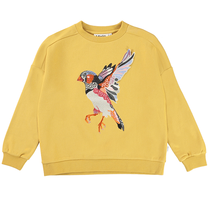 Джемпер для девочки Molo – это идеальный выбор для вашего маленькой модницы! Изготовленный из 100% хлопка, он украшен красочным принтом летящей птицы с разноцветными крыльями и ярким хвостом на желтом фоне. Нежная текстура ткани и удобная посадка делают этот джемпер комфортным и стильным. На фотографиях видна аккуратная вышивка птицы с контрастными крыльями и хвостом, а также мягкая эластичная резинка по низу и рукавам. Качество от бренда из Дании и внимание к деталям делают эту вещь отличным выбором для вашего ребенка!