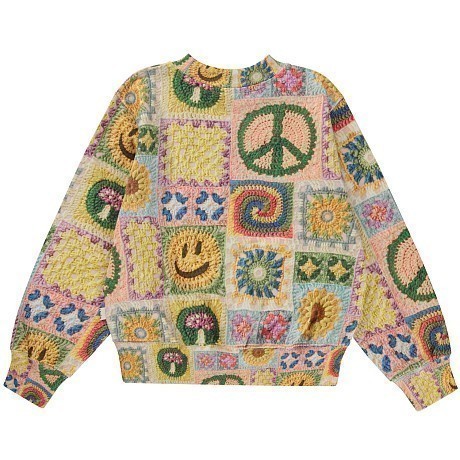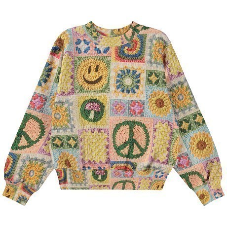 Джемпер для девочек от Molo – это идеальный выбор для вашего маленькой модницы! Изготовленный из 100% натурального хлопка, он украшен очаровательными цветочными мотивами и символами мира. Каждый квадратик на ткани – это маленький мир из цветов, улыбок и мирных знаков. Нежная текстура ткани и удобная посадка делают этот джемпер идеальным для повседневной носки. На фотографиях видны яркие цветы, улыбки и мирные знаки, а также аккуратные края и мягкая текстура ткани. Качество от бренда из Дании и внимание к деталям делают этот джемпер отличным выбором для вашего ребенка!